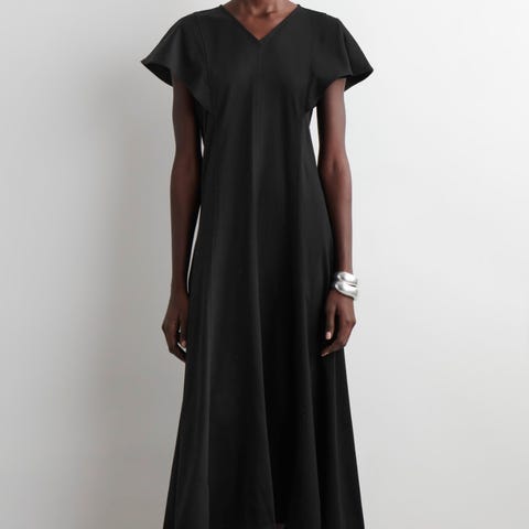 Moderne midikjole fra merket COS høst/vinter-kolleksjon. Laget av en flytende viskoseblanding, i en moderne form, med mykt fall som gir en lett og luftig passform. Kjolen har V-formet utskjæring og en halsringning med skjerfdetaljer som kan festes på plass. Fine knapper. I perfekt stand, da den kun har blitt brukt én gang. S/36.
