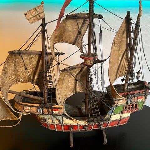 San Felipe 1690 modellskip i tre med detaljerte seil og rigging. Modellskipet har flere dekk og dekorative elementer, inkludert en bakre balkong med utskjæringer. Passer til samling eller dekorasjon.litt smårepp.å tørke støv.må få nytt hjem