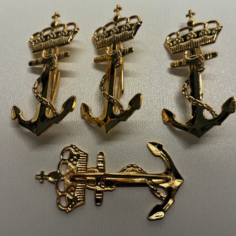 Designet inkluderer en krone og et anker omgitt av eikeblader, vanlig for marineemblemer.