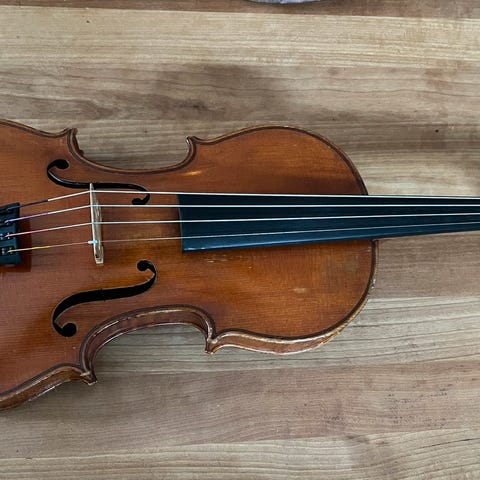 Selger en 100 år gammel fiolin. I henhold til alderen fiolinen ser veldig pen ut. Det står en norsk navn i fiolinen med håndskrift men det er vanskelig å lese.