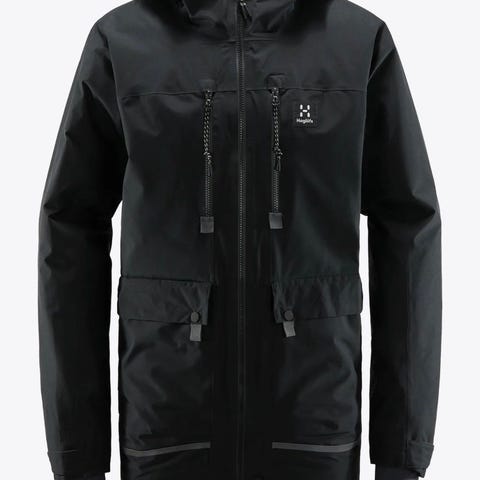 Haglöfs skalljakke i Gore-Tex. Jakken har en kombinasjon av svart og grå farge med neon glidelås. Jakke for krevende forhold.
