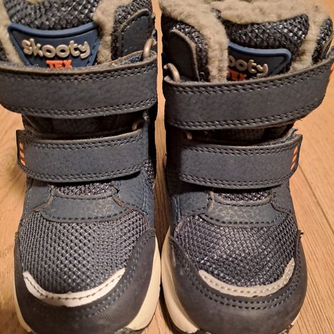 Barneskos størrelse 27 i unisex design med blå og oransje farger. Skoene har borrelåslukking og fôret innside for ekstra komfort. Yttersålen har mønster for godt grep. Materialet består av tekstil og syntetiske komponenter. Har kun vært på føttene til barnet mitt et par ganger, og er blitt for små. Men gods sko!