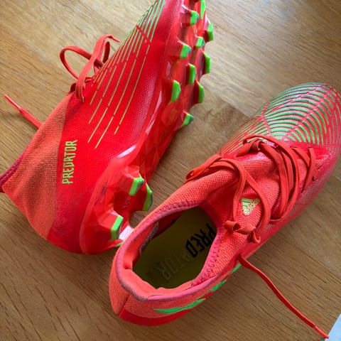 Adidas Predator fotballsko med blå og rosa farger. Skoene har en høy ankelkrage og knotter under sålen for bedre grep på banen. Designet for bruk på gressbaner. Størrelse 44 2/3
