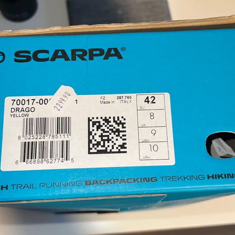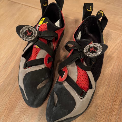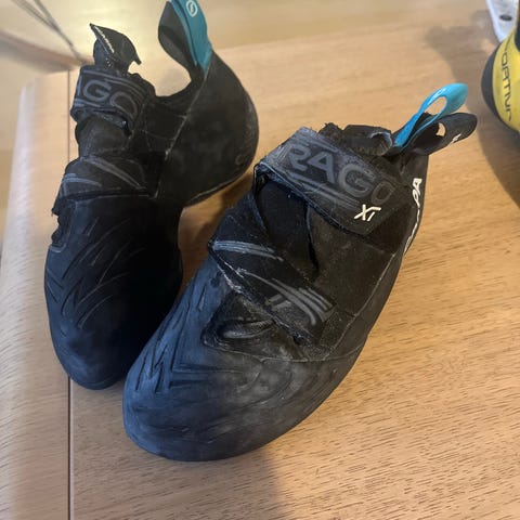 Scarpa Drago xt. Ikke klatra med, har bare tatt de på en gang, hvor jeg merket at de var for små. Kjøpte fra varuste.net 19. Desember for til sammen 1945kr inkl frakt. Tar i mot bud