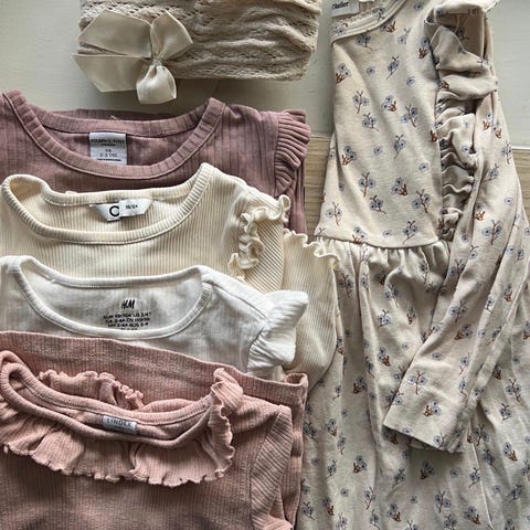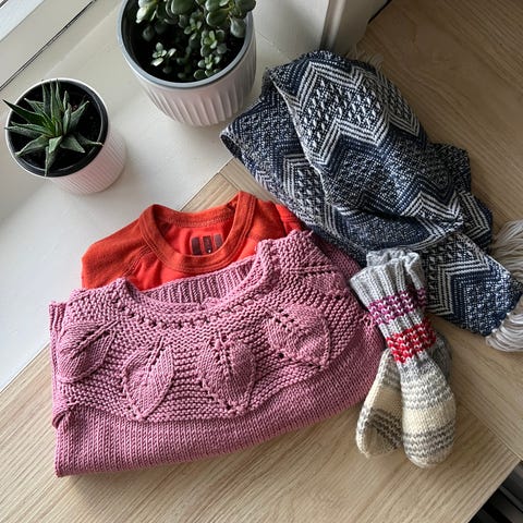 Klespakke med 3 ulltights, 1 genser og 1 cardigan. Kjempe myke og gode klær i str 98 (noe i 104, men det er krympet). Den røde genseren er i str 98/104. Noen anmerkninger (se bilder).