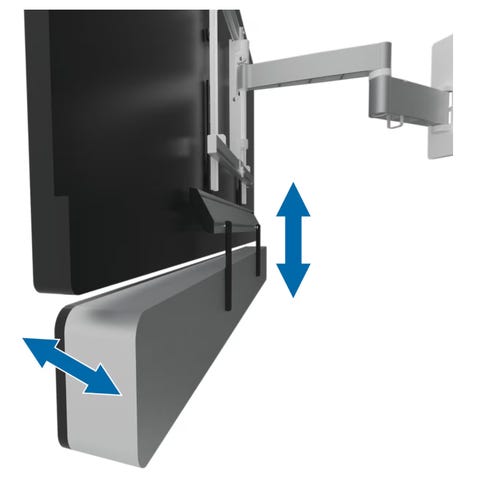 Vri flatskjermen uten at det går på bekostning av lydkvaliteten fra lydplanken ved hjelp av Vogels SOUND 3450 universale lydplankefeste. Når du vrir på skjermen følger lydplanken din etter slik at du alltid ser bildet og ikke mister synk. Høyden og dybden på festet kan justeres etter ulike størrelser og former, og kan brukes med nesten alle TV-veggfester. Lydplanken tåler vekt på opptil 10 kg.