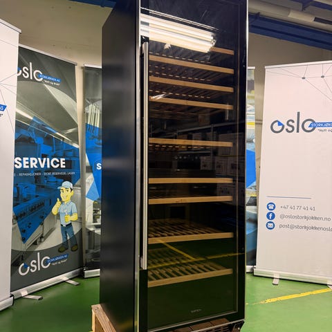 Vinoteca vinkjøler med glassdør og trehyller. Egnet for oppbevaring av vinflasker med temperaturkontroll. Designet for hjemmebruk eller mindre serveringssteder.