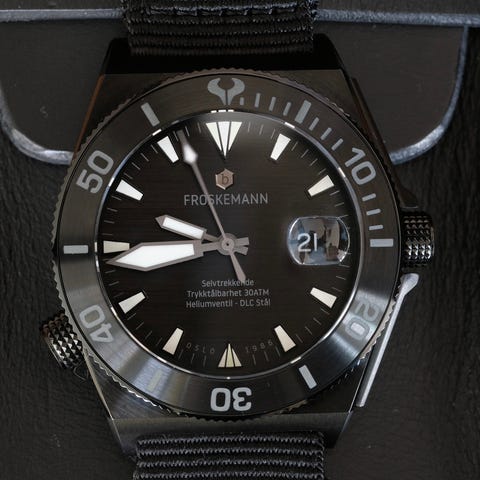 Bragdur Froskemann – DLC/PVD - Komplett med etui og 2 reimer. Nypris 13 900,-