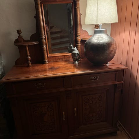 Antikk skjenk i tre med utskårne detaljer og skuffer