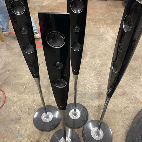 LG høyttalersystem i svart farge komplett. Systemet består av flere høyttalere 2 små og 2 mellomstore, inkludert en center, designet for å gi lyd i flere kanaler. Egnet for bruk sammen med hjemmeunderholdningsanlegg.Helg genialt god lyd brukt lite .