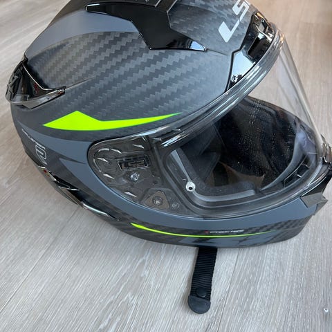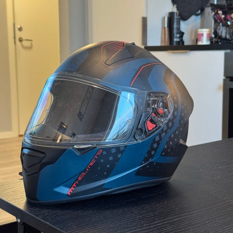 God hjelm fra MT Helmets Blade 2 motorsykkelhjelm i svart farge, størrelse L (59-60 cm). Hjelmen veier 1650 gram og er sertifisert etter ECE og DOT standarder. Den har et klart visir og polstret innside for komfort. Hjelmen har også quick strap
