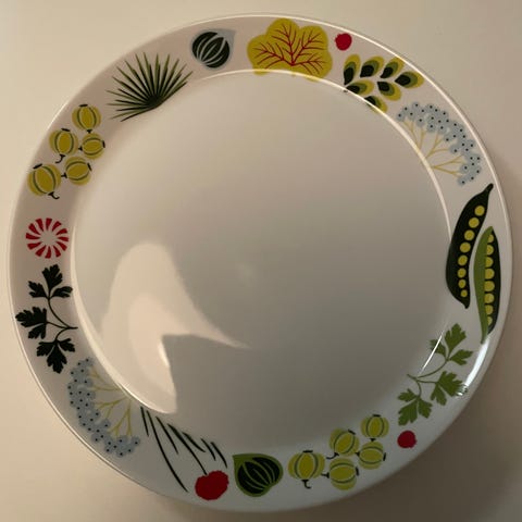 Ivory tallerkensett med blomsterdekor. Sett består av tallerkener med grønn kant og blomster i midten. Passer til daglig bruk og servering.