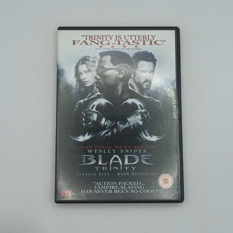 Blade Trinity DVD med Wesley Snipes, Jessica Biel og Ryan Reynolds. Actionfilm med undertekster på norsk, svensk, dansk og finsk. Inneholder ekstramateriale som slettede scener og kommentarspor.