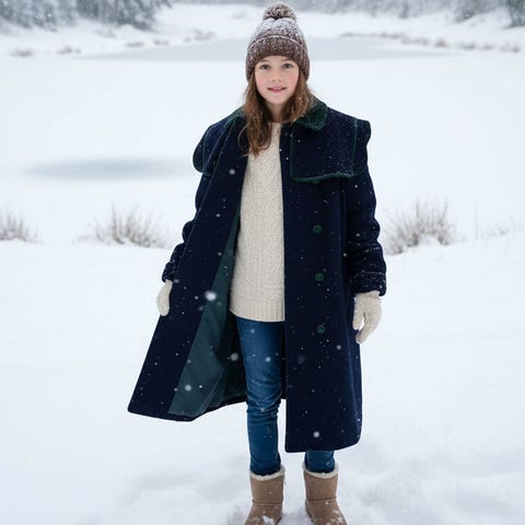 Kanadisk dobbeltspente, fôrete ullkåper i 80% ull med rødt skjerf og gullknapper. Avtagbar og vendbar hette. Farge marine. Kåpene er navnet.