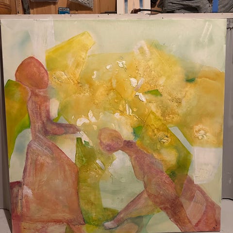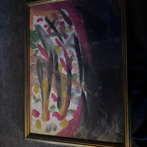 Abstrakt kunstverk med fargerike og tredimensjonale elementer. Veggdekor laget med ulike materialer som skaper dybde og tekstur. Passer til dekorasjon i hjem eller kontor.