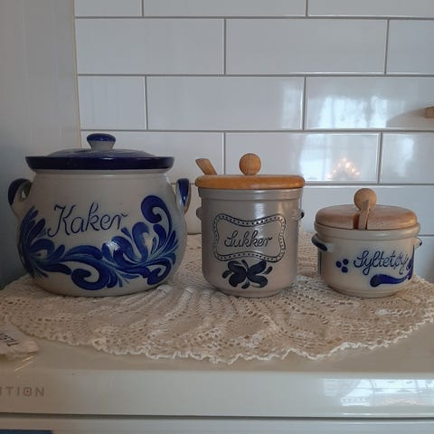 krydderikrukker i porselen, inkludert fem krukker merket Sukker, Potetmel, Sago, Kaffe og Gryn. Krukkene har blå dekor på hvit bakgrunn og håndtak på toppen for enkel åpning. Passer til oppbevaring av tørre matvarer på kjøkkenet. Selges fra dødsbo