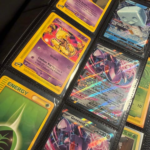 Her er det fult opp av ulike vintage kort til 20 kr per. De fleste kortene er fra år 1999-2002, men noe annet også. Permene inneholder kort som Charmander, kabuto. Oddish og mange andre klassikere. Tilstanden varierer i stor grad, noen er veldig fine og andre er svært slitt. Jeg tar ikke flere nærbilder av enkeltkort. Jeg kan sende trygt med posten. Kjøper velger og betaler frakt.