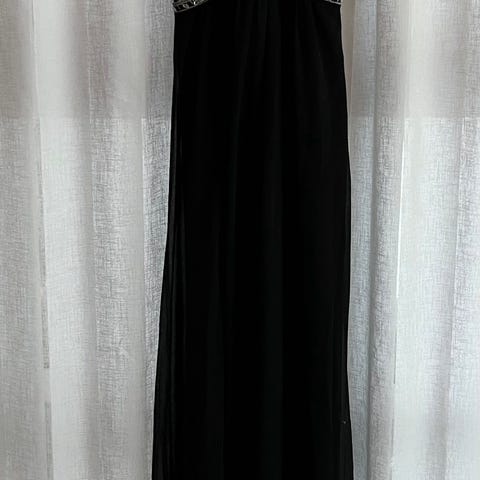 festkjole i størrelse 42 for kvinner. Kjolen er flerfarget og laget av materiale med paljetter. Designet har lange ermer og en dekorativ overflate med paljetter som gir et festlig uttrykk.
