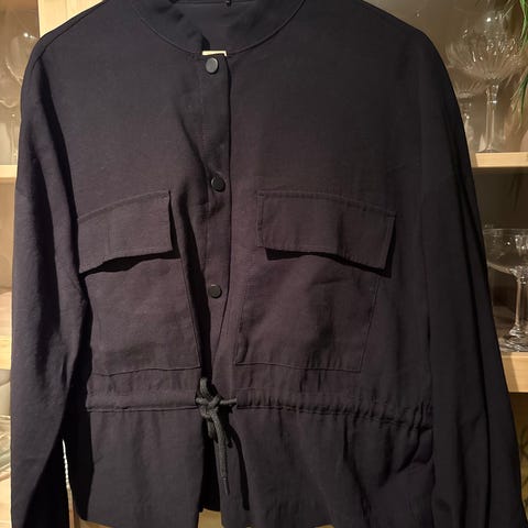 jakke i størrelse M. Jakken har svart og hvit farge med detaljer i svart rundt kanter og knapper. Passer for kvinner.