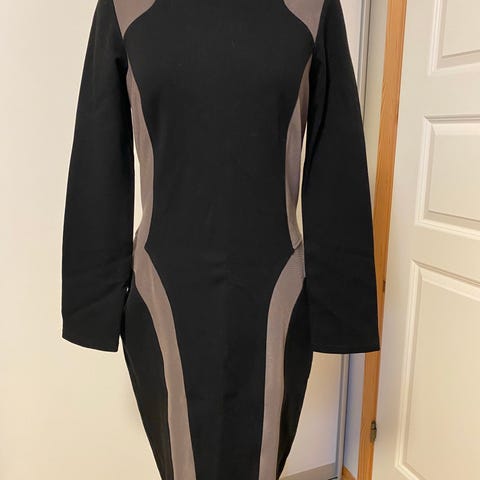 En flott, sort kjole fra Nina Jarebrink med glitter i gull. Dette er en vid, rett modell som gjør seg godt med belte til. Folder i skuldrene hvor det vide stoffet i kjolen er samlet. Kjolen er i veldig pen stand. Perfekt til julefesten :)