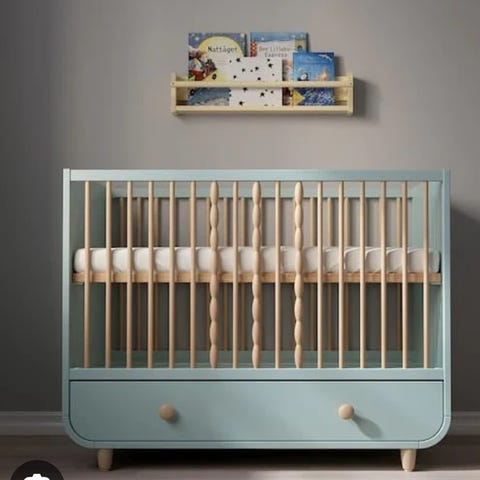 Barneseng med madrass 2 i 1, som ny ! (seng og vugge)Den passer 0-5 år. Bunnen og veggen på sengen er justerbar til 3 nivåer, slik at du kan flytte den til sengen på samme nivå og babyen vil sove ved siden av den uten vegg, uten frykt for å falle.