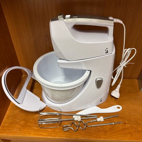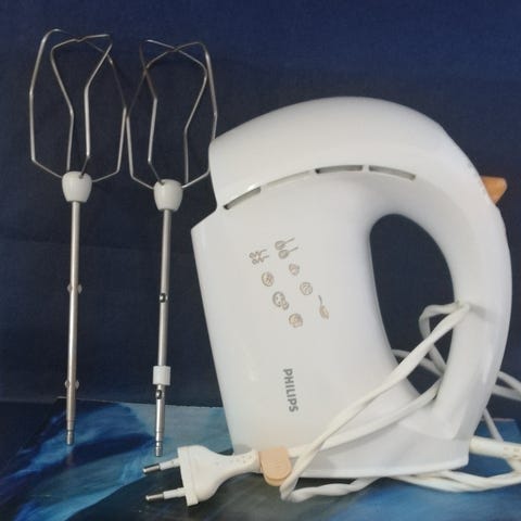 Hvit håndmikser med tilhørende visper og eltekroker. Passer til blanding og elting av ulike matvarer. Utstyrt med ledning for strømtilkobling.