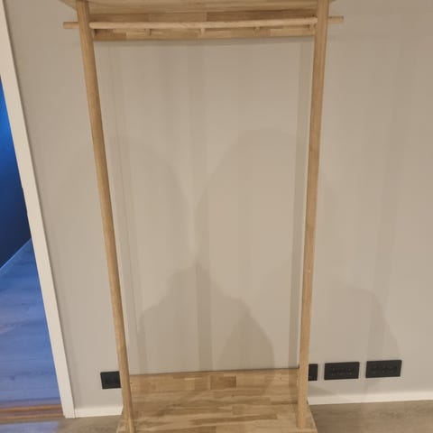 Fint ,praktisk og romslig skap i eik med hyller og skyvedører.
