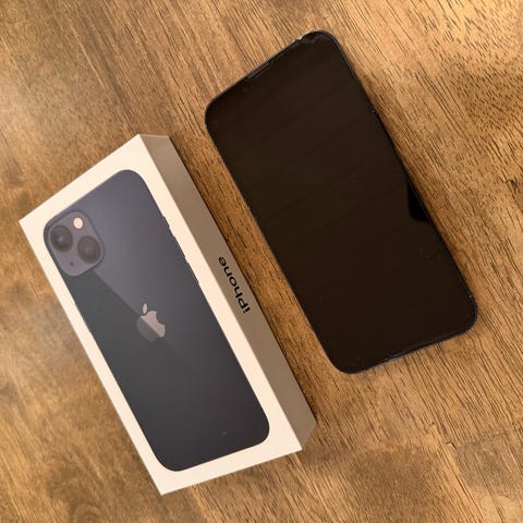 Apple iPhone 13 med 128 GB lagringskapasitet i blå farge. Telefonen har en skjerm med synlige riper og baksiden viser normale bruksmerker. Batterikapasiteten er 84 %, med optimalisert batterilading aktivert.