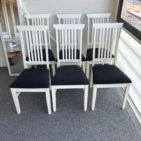 8 spisestoler fra IKEA, hvite med grått stoff på setene, utrolig pent brukt.