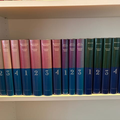 Ulike bøker i serien "Søyler i norges litteratur" utgitt av Aschehoug i 1987.