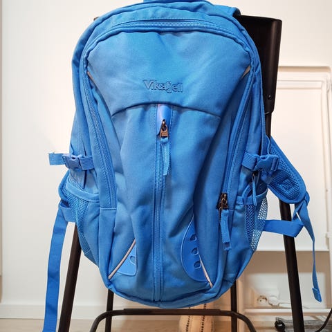 Vikafjell tursekk, 28 liter, selges videre i fargen blå/turkis. Noe slitasje, men ikke mye.