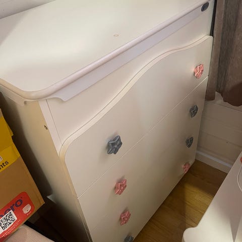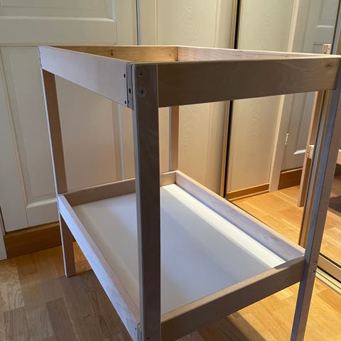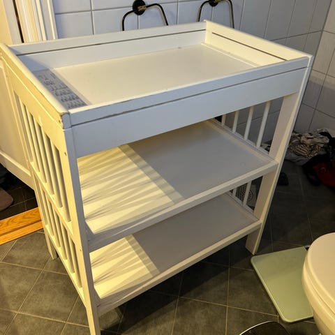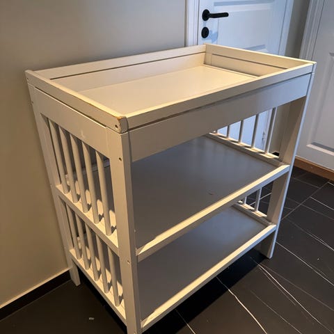Stellebord med to romslige skoffer. Det er synlige bruksmerker på kommoden, men ingenting ødelagt. To romslige skuffer som glir veldig godt. Praktisk at det fungerer med som en vanlig kommode med hyller når ikke stellebordet brukes så mye lenger.