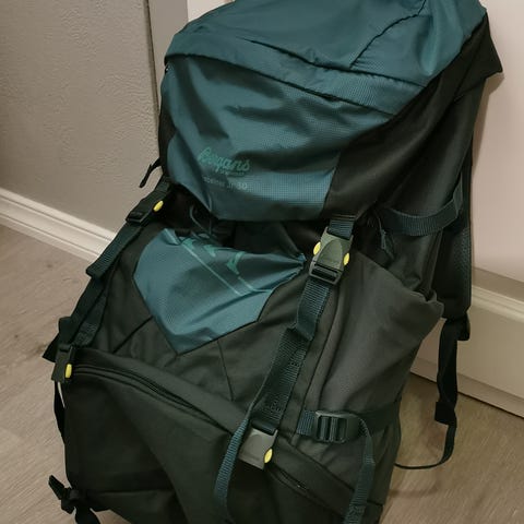 Bergans Birkebeineren 40 ryggsekk i blå farge. Ryggsekken har en kapasitet på 40 liter og er designet for utendørs bruk. Den har justerbare stropper og polstret ryggpanel for komfort under bæring. Det følger med et regntrekk til sekken som vist på siste bilde