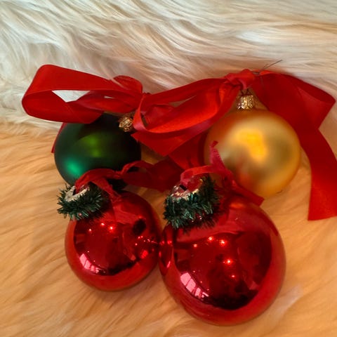 Åtte gamle juletrekuler selges samlet for 400 kroner. Hele, men synelig brukt.