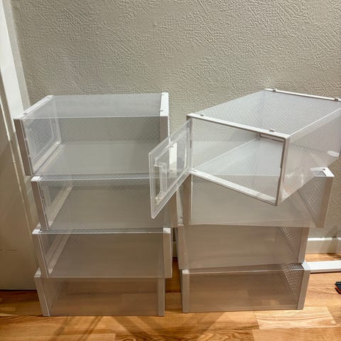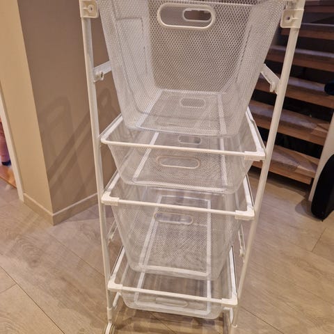 Selger 2 moduler (stativ + 4 kurver fra Biltema). Pris kr. 150,- pr. stk. Bilde av to moduler oppå hverandre. Mangler en kurv.