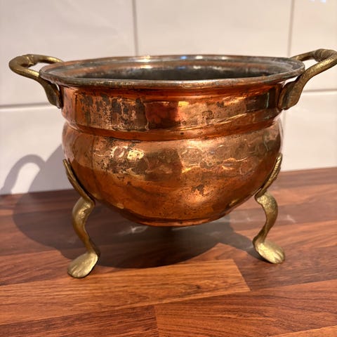 kobbergryte, kobberkjele, kobbergryte med håndtak, antikk kobbergryte, gammel kobbergryte, kobberkar, kobberbolle, kobberfat, kobberpanne, massiv kobber, håndlaget kobber, naglet kobber, kobbernagler, smidde håndtak, jernhåndtak, smijern, vintage kobber, antikk kjøkkenutstyr, gammelt kjøkken, retro kjøkken, rustikk stil, landlig stil, gårdsstil, bonderomantikk, fransk landstil, nordisk interiør, klassisk interiør, dekorasjon, interiørdetalj, plantekar, blomsterpotte, krukke, gryte til dekor, patina, grønn patina, ekte patina, brukt antikk, ca 1900, 1800-tallet, tidlig 1900-tall, husholdningskar, syltegryte, saftgryte, melkekar, bryggekar, kobber til brygging, antikk bruksgjenstand, samlerobjekt, vintage interiør, stilfull dekor, unik dekor, håndverk, europeisk kobber, fransk kobber, skandinavisk kobber, gammel husholdning