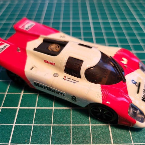 Selger her et dNaNo chassis for Porsche 917 K med karosseri som er malt opp med Petronas-farger og vinyl-dekaler.