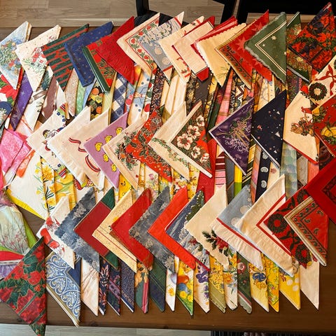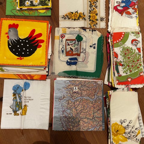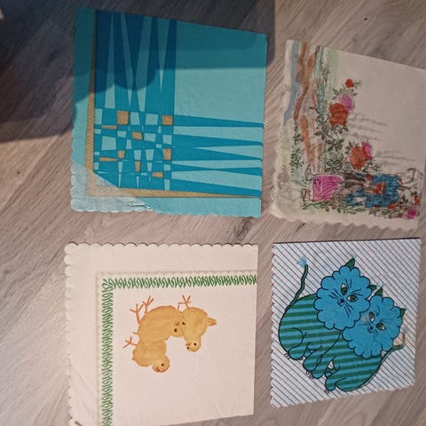 Et utvalg av diverse servietter med ulike mønstre og farger. Serviettene varierer i design, inkludert blomster, figurer og abstrakte motiver. Materialet er ikke spesifisert. Gi bud