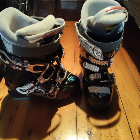 Innersåle i slalomskoene er ca 24 cm og tilsvarer størrelse 38. Noe slitasje frempå skoene, men har ingenting å si for bruken.