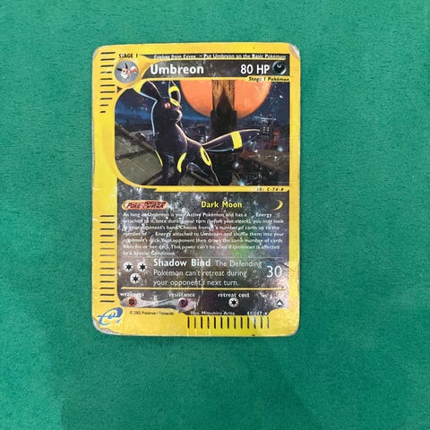 Pokémon Umbreon holografisk samlekort med 100 HP, angrepet Darkness Fang med 70 skade. Kortet har en illustrasjon av Umbreon og er en del av Pokémon samlekortspill.