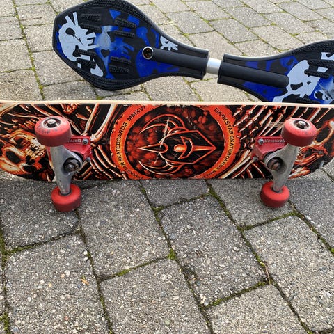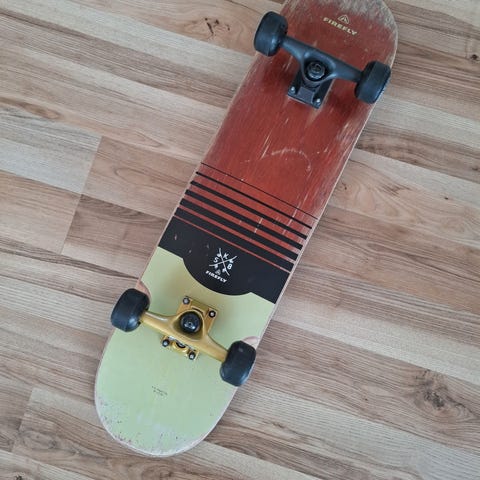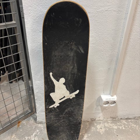 Creature Skateboard med sort dekk og hjul. Brettet viser tegn på bruk med slitasje på overflate og hjul. Egnet for skateboarding og triks. Skater veldig fint. God vekt på brettet for fart og triksing.