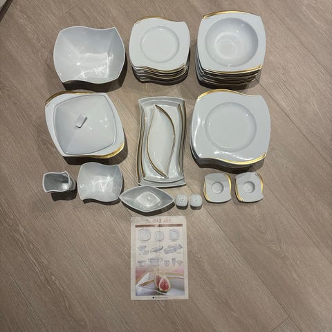 8 tallerken, 4 asjetter og ett serveringsfat