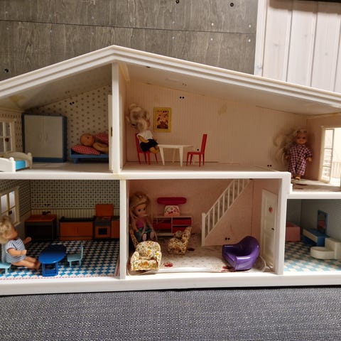 Lundby Barneleker Hund med valp i plastmateriale, designet for barn over 4 år. Produktet inkluderer en voksen hund og en valp, egnet som tilbehør til dukkehus eller som samleobjekt.