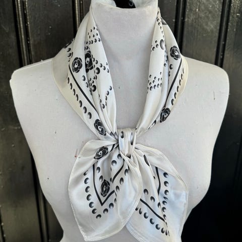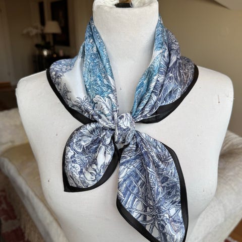 Nydelig silkeskjerf i blåtoner. Mykt og behagelig. 100%silke. Enkelt å dandere på ulike måter da silken er så fin. Helt som nytt. Størrelse 68x68cm . Kan gjerne sende med posten til 31.-