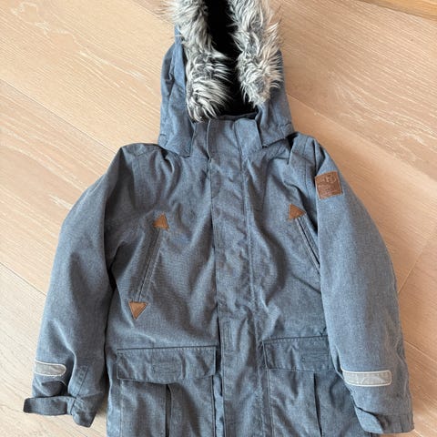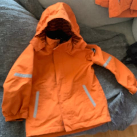 Polarn O. Pyret barn jakke i størrelse 122, unisex. Jakken er lilla og laget av slitesterkt, vannavstøtende materiale med tapede sømmer for vanntetthet. Den har pustende egenskaper, er vindtett og har refleksdetaljer for økt synlighet. Hette med avtagbar pelskant.