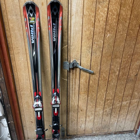 Völkl tigershark carving 101 med bindinger. Skiene har en svart, hvit og rød fargekombinasjon.