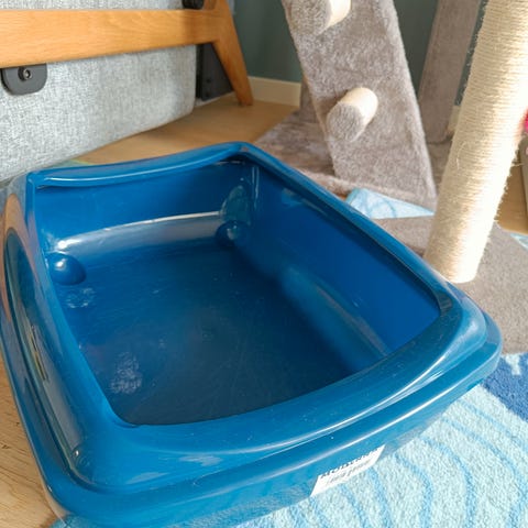 Kattetoalett med lokk i hvit plast, inkludert skuff og håndtak for enkel transport. Medfølgende klorestativ i grått stoff med klorestolpe og hule for katter. Egnet for katter som trenger både toalett og kloremuligheter.
