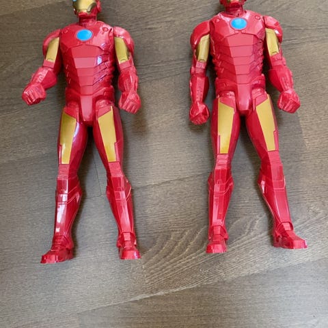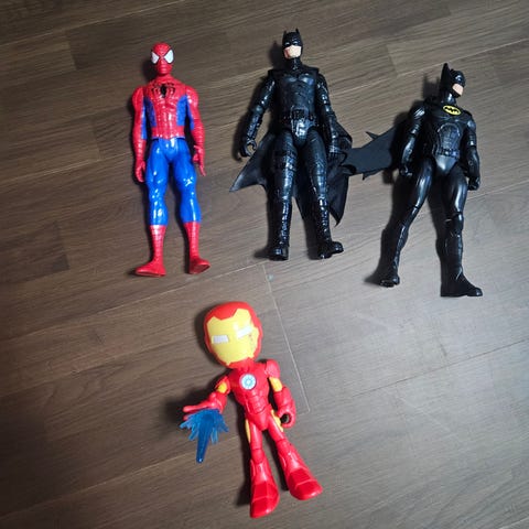 Store og små actionfigurer. Spiderman, Batman, Captain America, Shark Man (?), m.fl. Den største Spiderman har også egen motorsykkel. Diverse ekstrautstyr (jeg er usikker hvem de tilhører).