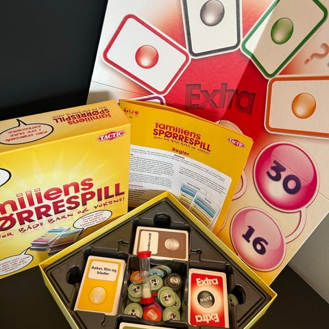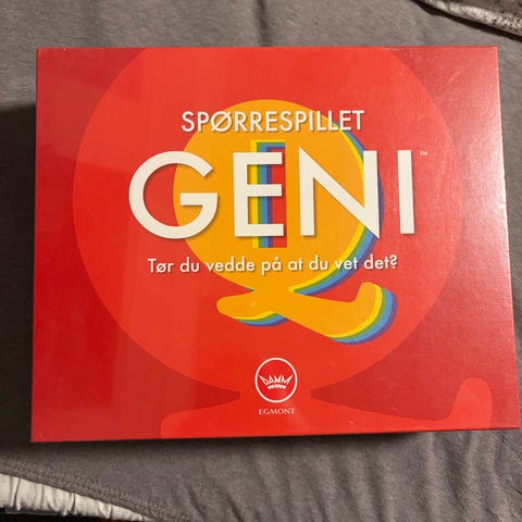 Watt & Veke Geni Spørrespil brettspill med spørsmålskort, spillbrikker og terning. Inneholder spillebrett, kort, brikker i flere farger, og instruksjoner. Spill for flere deltakere som tester kunnskap og hukommelse.