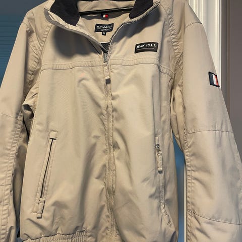 Jakken har flere lommer. Kan strammes inn både nede og oppe ved halsen.